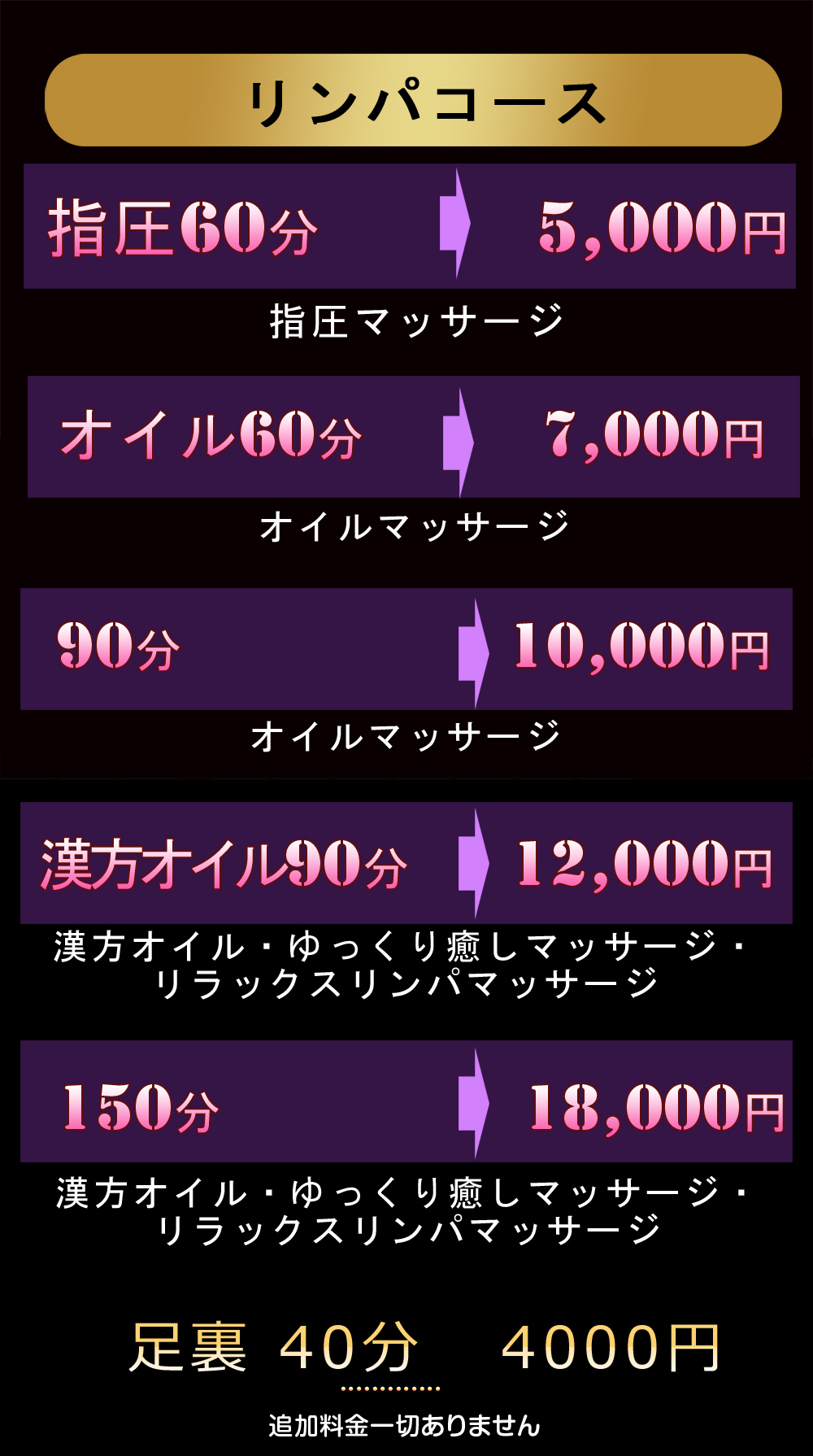 ※ご来店後のコース時間短縮はご対応出来ません。ご予約時にお伝えした料金を頂戴させて頂きます。変更がある場合は必ずご来店前にお電話でお申し付け下さい。